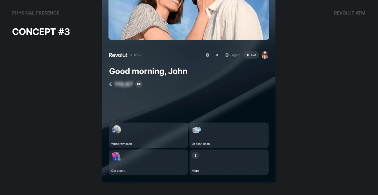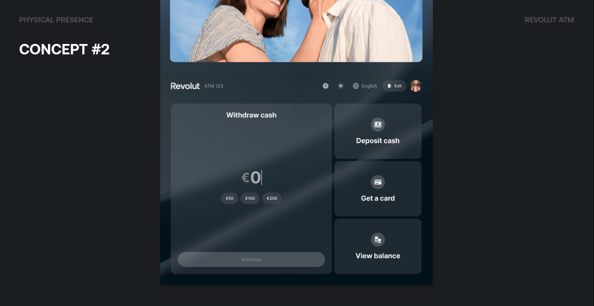 Concept #2 put Withdraw cash upfront with a large amount input (€0 and quick options like €50, €100, €200) and a Withdraw button, while keeping Deposit cash, Get a card, and View balance as secondary actions. We experimented with default app wallpapers, user picture customization, and glass-like blur effects to make the ATM feel closer to the Revolut app without copying it.