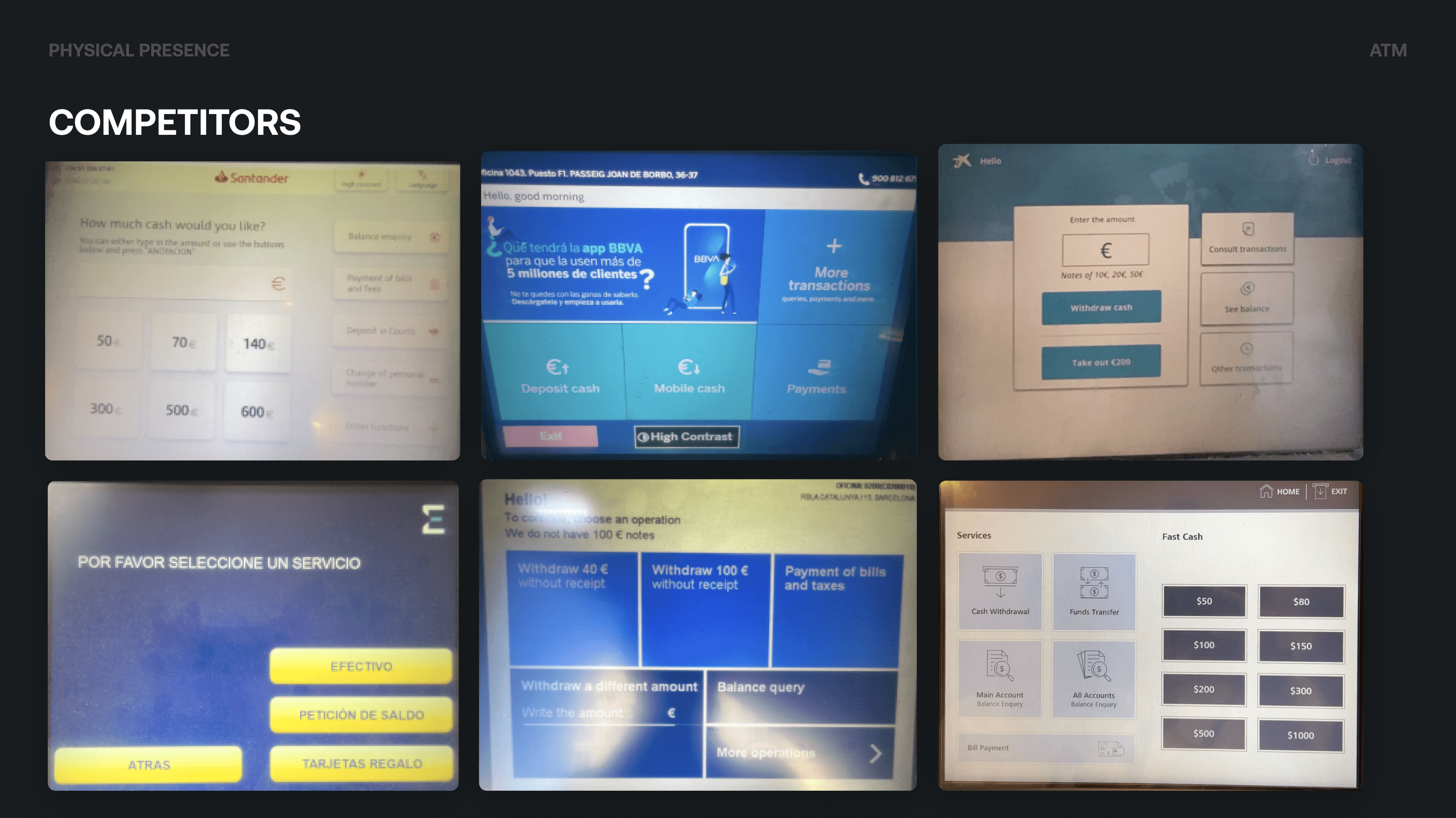 We benchmarked incumbent and digital-first players, including CaixaBank, Santander, Sabadell, Euronet, BBVA, and Tinkoff Bank. We mapped how they handled flows such as general intro, language selection, unauthorised cards, withdraw and deposit cash, collect card, exit session, and loading/performance. That gave us a clear picture of industry norms and where we could differentiate on clarity, transparency, and a mobile-app-like feel.