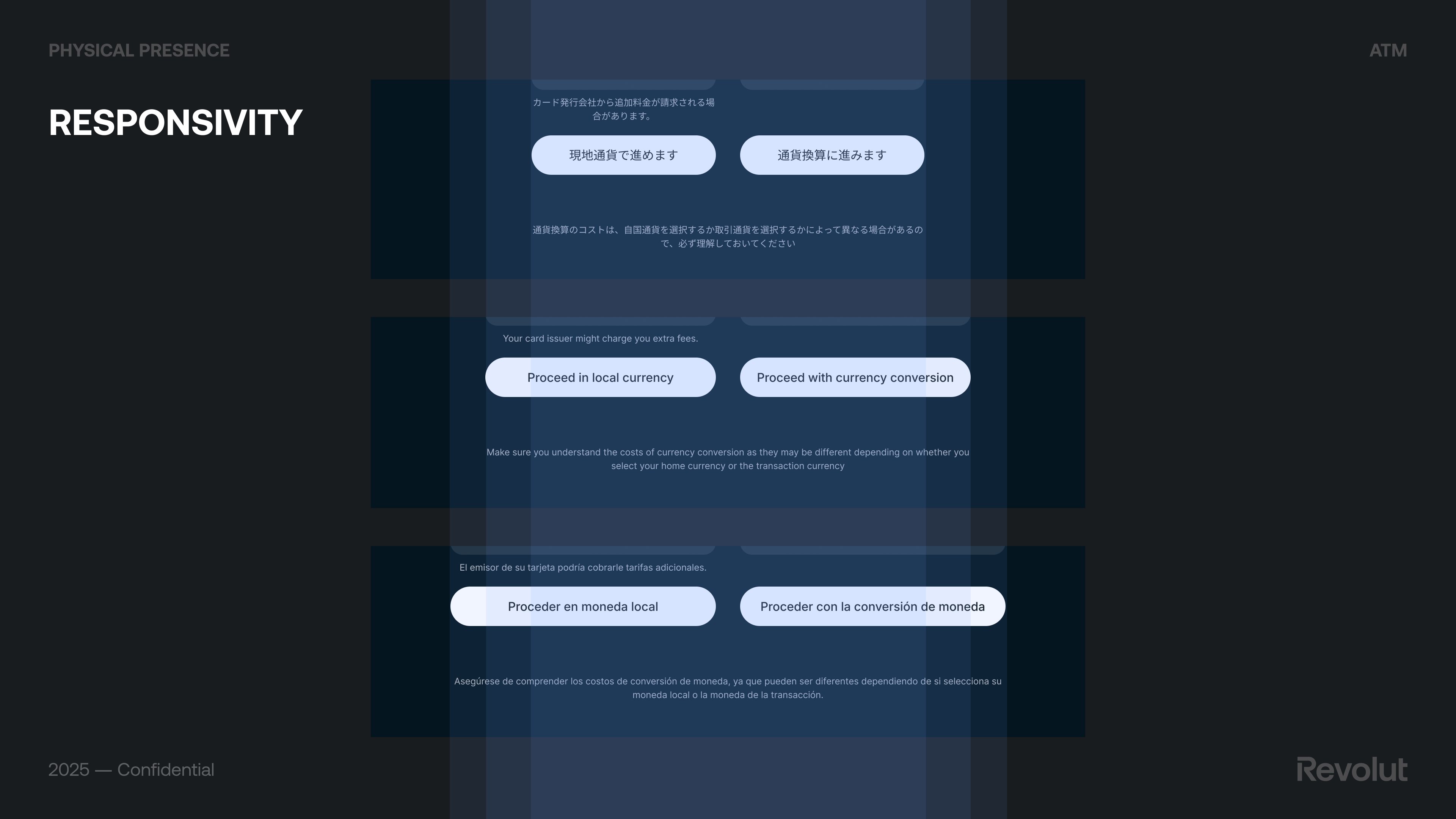 The ATM screen is large (1920×1080 px, 68 ppi, multitouch)—very different from a smartphone. We explicitly compared it to a typical phone (e.g. ~5.4” display, much higher pixel density) to avoid the trap of scaling the Revolut app 1:1. The kiosk is used at arm’s length, in a standing position, often in a hurry; we needed a dedicated layout, larger touch targets, and a clear hierarchy so the experience felt native to the machine, not a blown-up app.