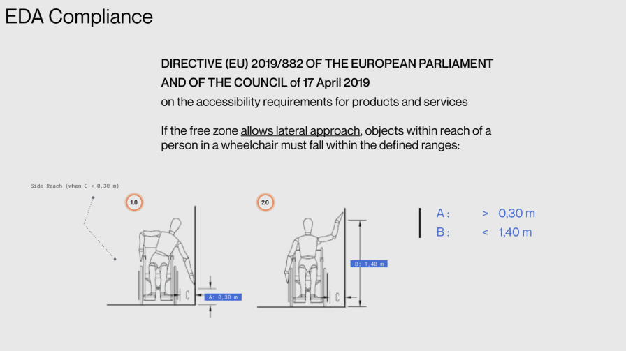 We designed for the European Accessibility Act (Directive (EU) 2019/882 on accessibility requirements for products and services). For lateral approach by wheelchair users, interactive elements had to fall within defined reach ranges: horizontal clearance A > 0,30 m and vertical reach B < 1,40 m. We also defined the operational area (screen, card reader, keypad, cash vault) and advertising area, with overall height in the 2,05–2,15 m range and clear space in front of the machine (< 30 cm toe/knee clearance) so that the ATM could be used comfortably by everyone.