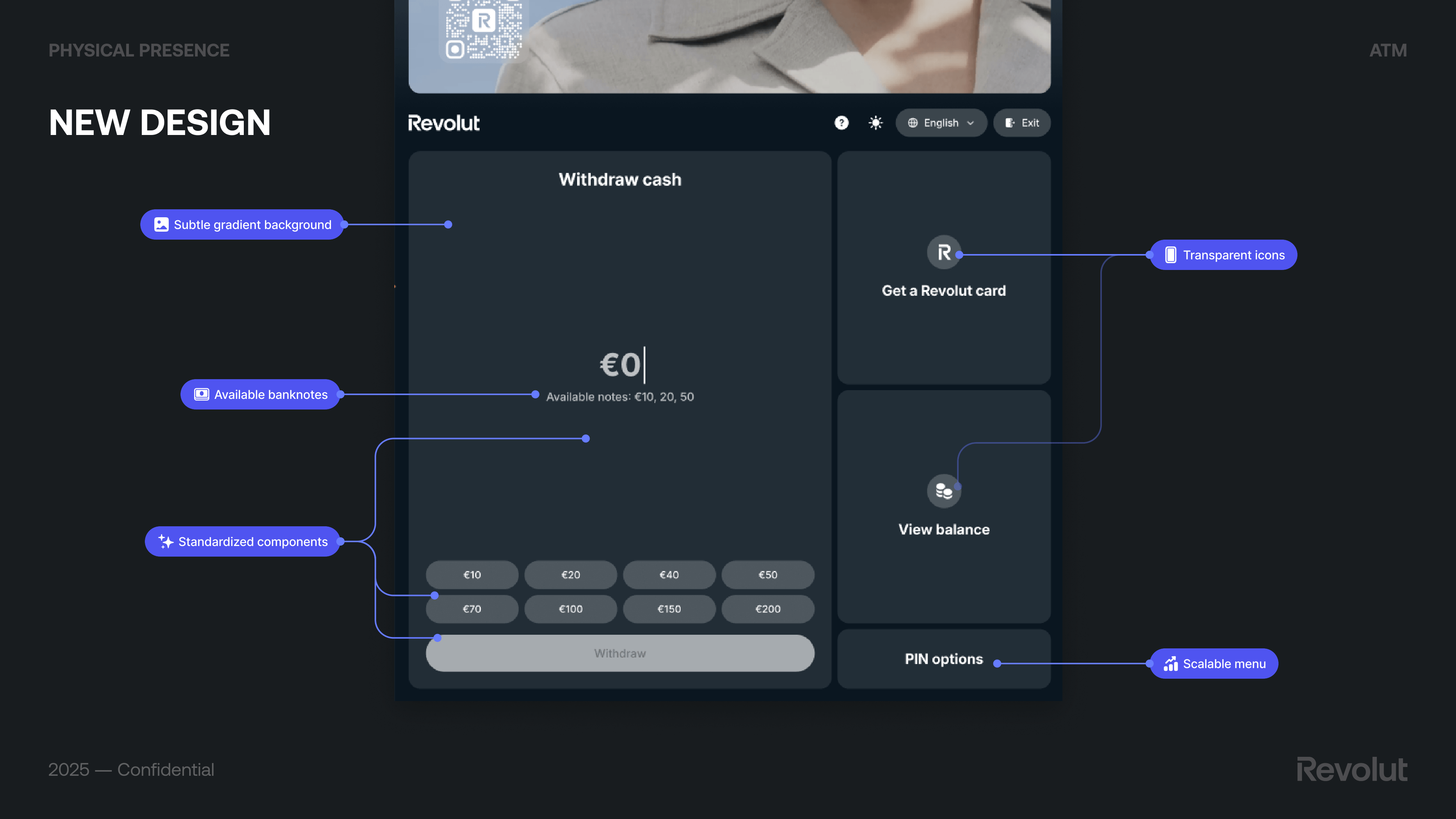 The final design (New design) kept the withdraw flow central and added: subtle gradient background, transparent icons, available banknotes clearly stated, standardized components, and a scalable menu. Preset amounts (e.g. €20–€1,000), Get a Revolut card, View balance, and PIN options completed the supporting actions.