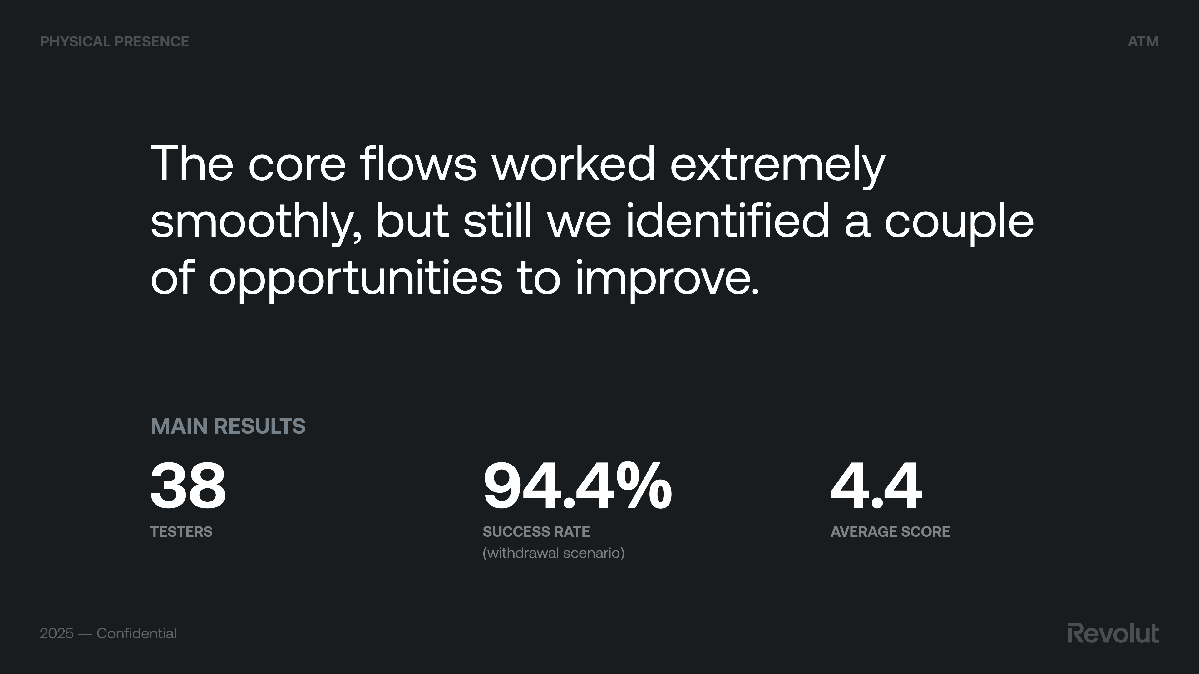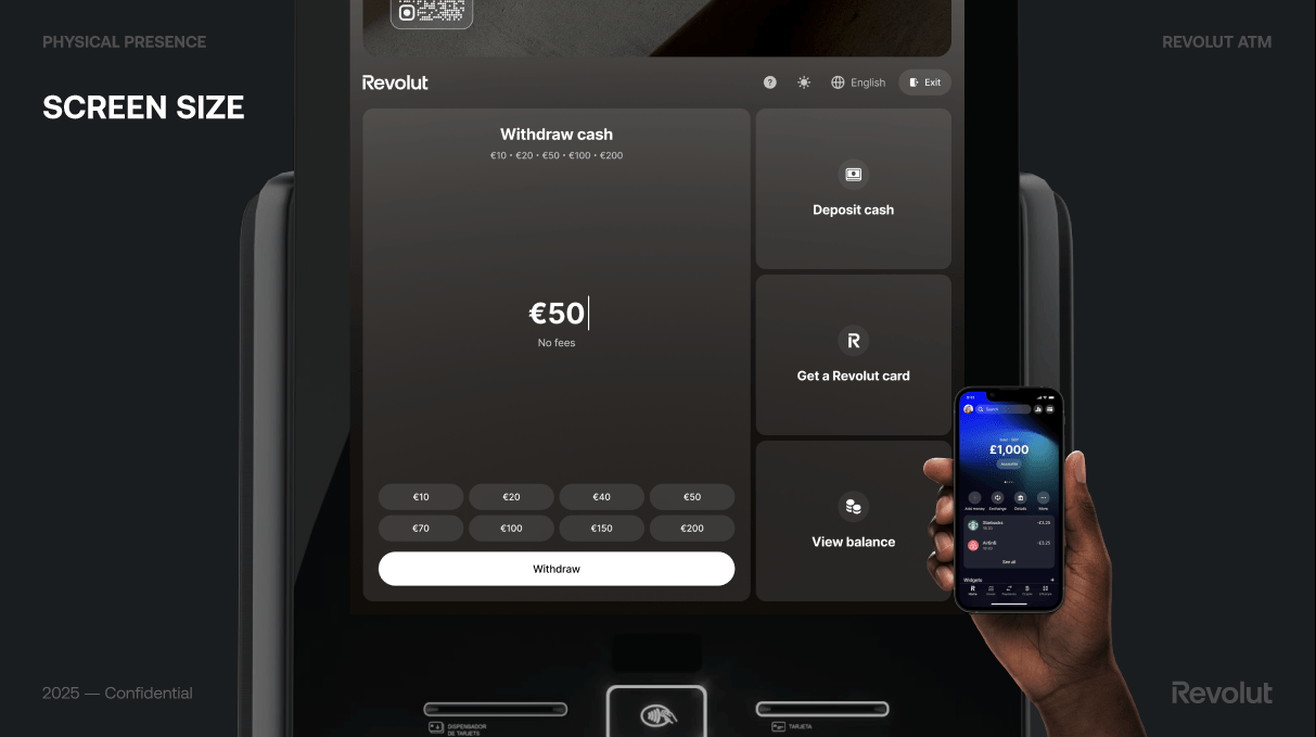 Revolut is a British multinational neobank that offers services for individuals and businesses in over 48 countries. Launched in the UK in 2015 with money transfers and exchange, it now has more than 55 million customers using dozens of innovative products. ATMs are a physical extension of that product: they had to feel consistent with the app and brand—simple, fast, trustworthy—while serving users in short, often time-pressed sessions.