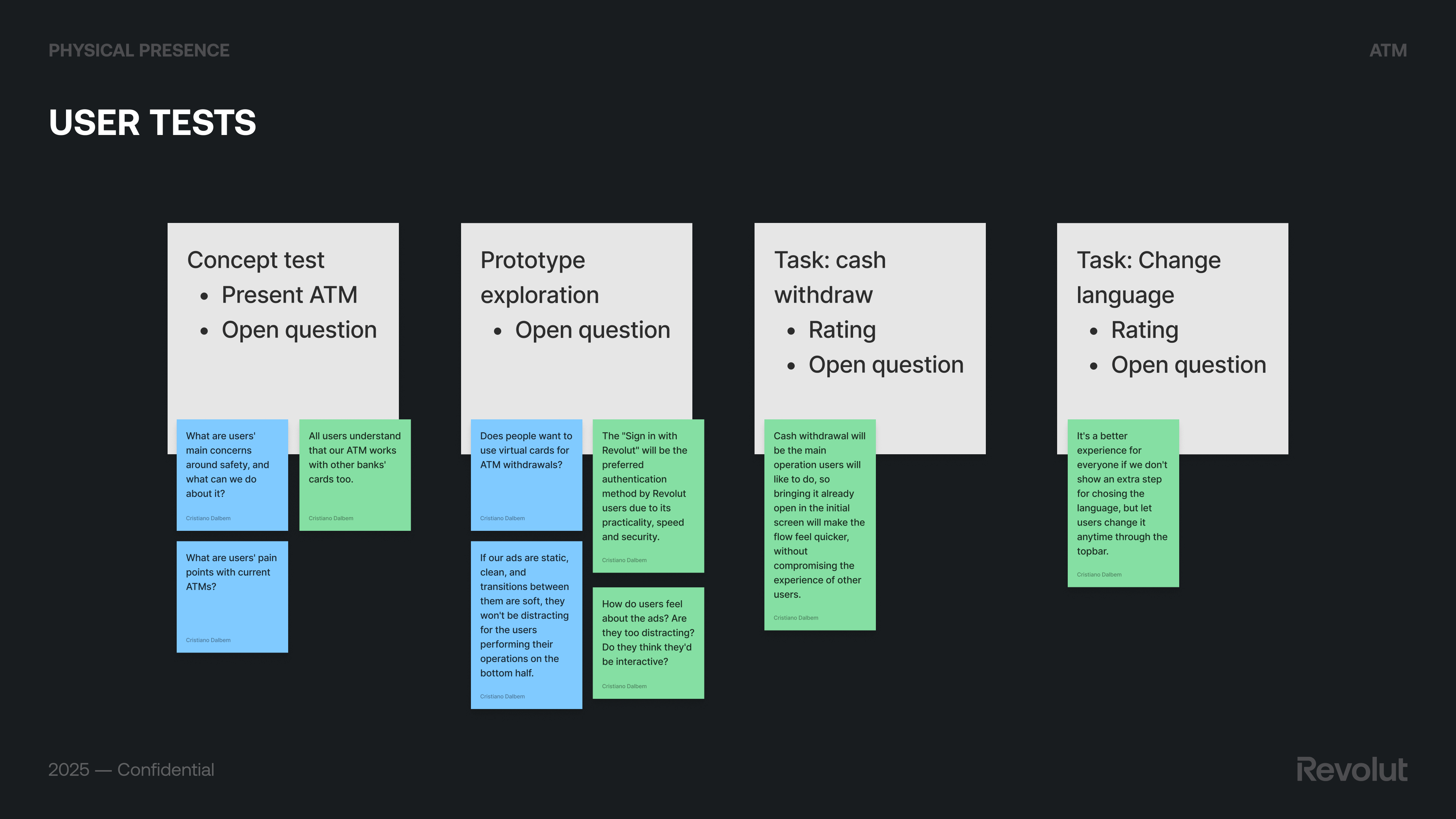 We ran user tests with a mix of concept tests (e.g. “What are users’ main concerns around safety?”), task-based scenarios (cash withdraw, change language), and prototype exploration (e.g. virtual cards for ATM withdrawals, preference for “Sign in with Revolut”). Key takeaways: users understood that our ATM works with other banks’ cards too; bringing cash withdrawal already open on the initial screen made the flow feel quicker; letting users change language anytime via the top bar was better than an extra step; and static, clean ads with soft transitions weren’t distracting. We used Maze for unmoderated research to run tests quickly and at scale.
