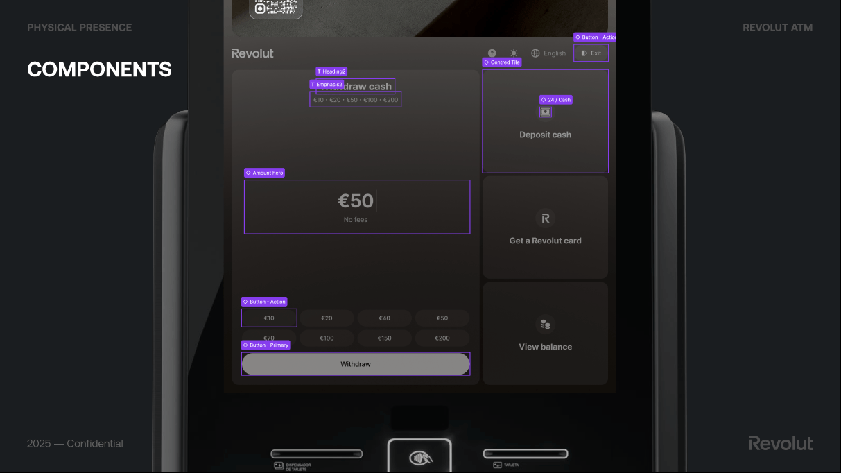 The ATM had to feel part of the same ecosystem as the Revolut app. We referenced the app’s patterns—accounts, balance, language selector, exit—where it made sense, so existing customers felt at home while we still optimised for the physical, single-session context. That balance between familiarity and kiosk-specific design was a constant in the foundations.