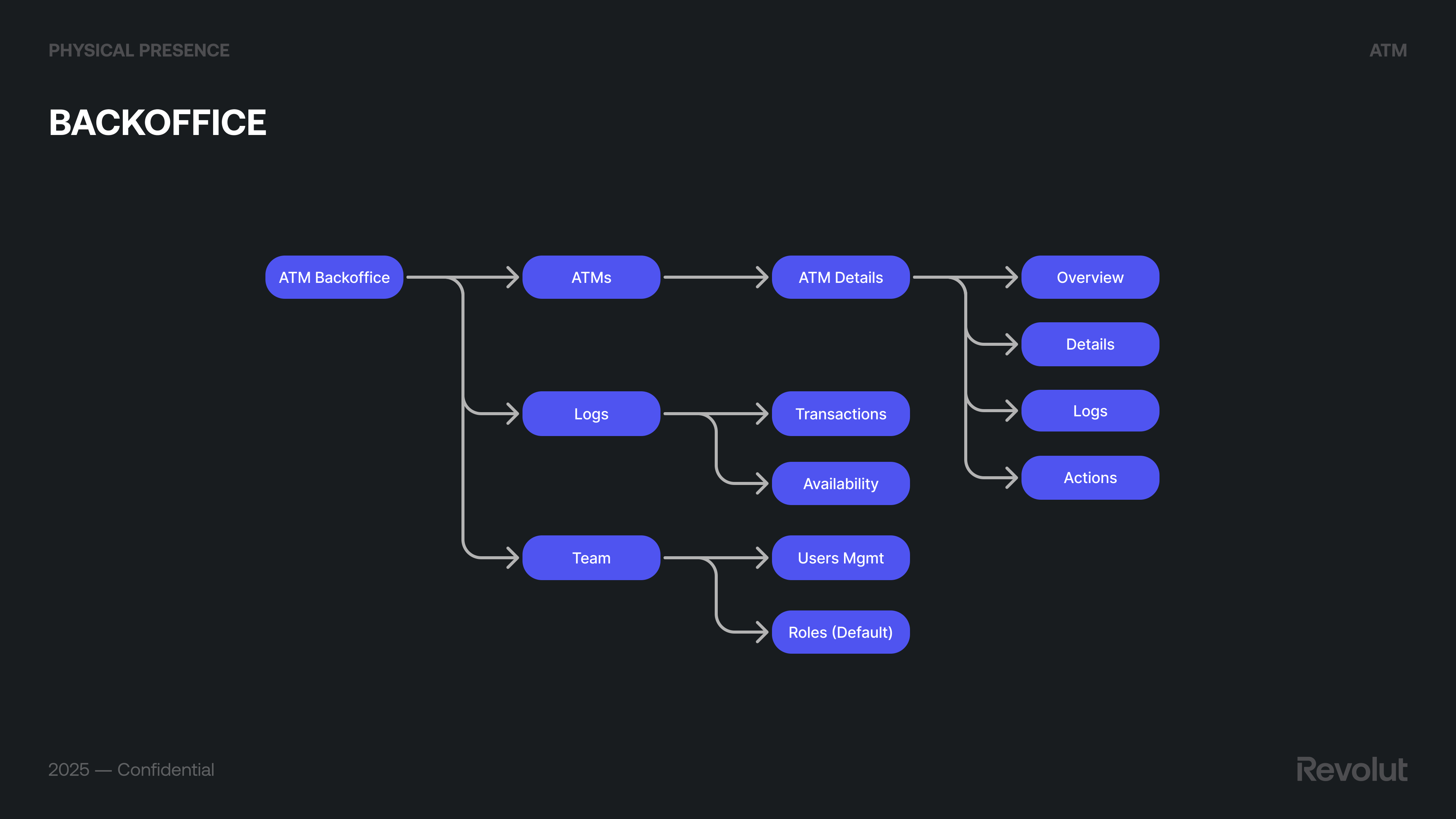 We worked with the vendor’s ATM management system (Monimanager) and designed Revolut’s ATM Backoffice on top: ATMs list and ATM details (Overview, Details, Logs, Actions), Transactions, Availability, Users management, Roles (e.g. default team roles), main dashboards, and user management. This gave ops and support a single place to see machine status, handle incidents (cash levels, connectivity, errors), and configure settings. Future improvements (e.g. richer analytics, automation) were scoped so the product could evolve without losing clarity for day-to-day operations.